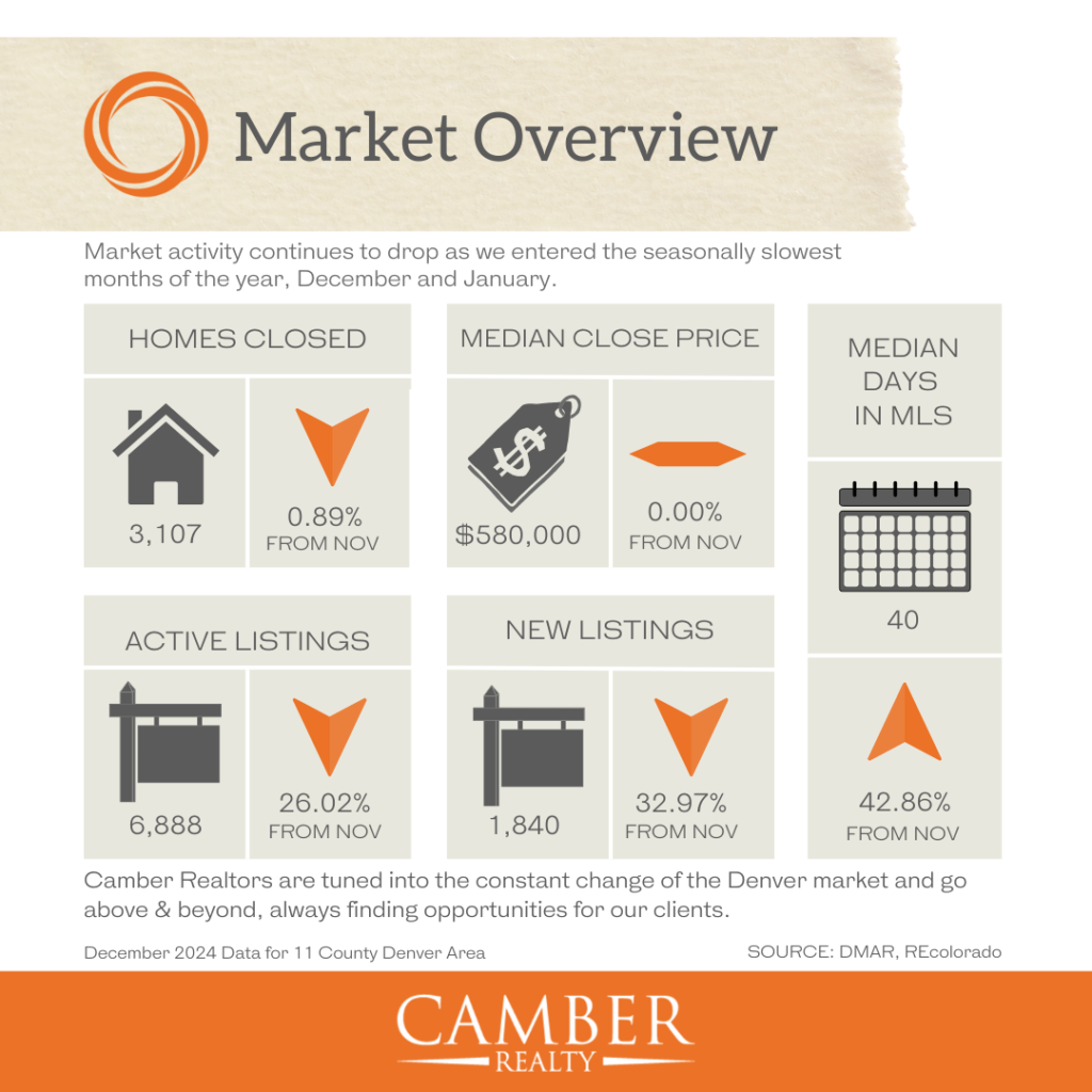 Denver real estate market activity continues to drop as we entered the seasonally slowest months of the year, December and January. Camber Realtors are tuned into the constant change of the Denver market. They go above & beyond, always finding opportunities for our clients. Questions? Want to discuss the market further? Reach out to your favorite Camber Realty agent. If you don’t know one of us yet, connect to our main line at (303)780-7300 / contactus@camberrealty.com.